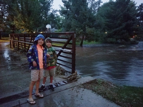 Hello! Adrian (and my mom) here – it’s been a very long time since we posted anything. It’s great to be back! Unless you were hiding under a rock, you heard the crazy storm we had tonight. Well, I went to the source and checked things out for myself and I’m here to report that while the enormous flash flood took over much of Robert McWilliams park, fondly known by locals as the “Dinosaur Park,” the playground is still standing! The basketball courts look alright, the field was partly flooded and, as you can see from the pictures, the bridge was almost underwater! Other kids were there checking things out too. I’ve climbed trees, played baseball, splashed in the creek with my brother, and enjoyed popsicles with my first grade class all at this very park! I care about what happens to our land and water and I was happy to see other kids checking things out too. Getting involved in our community helps us stay informed! Did you go outside during the storm? What was it like for you?